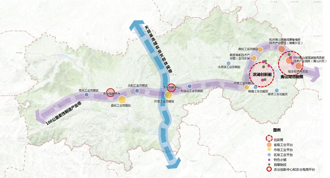 “一轴”:即临金天目溪发展轴,以临金高速、天目溪、分水江沿线城镇和乡村为空间载体,导入创新创意功能和农业休闲体验功能,链接长三角与杭州拥江战略。