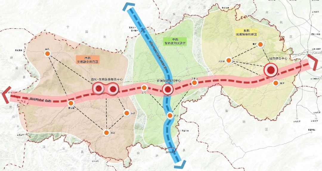 “三心”:即东部城市综合中心、於潜智造农创中心、昌化—龙岗旅游服务中心。