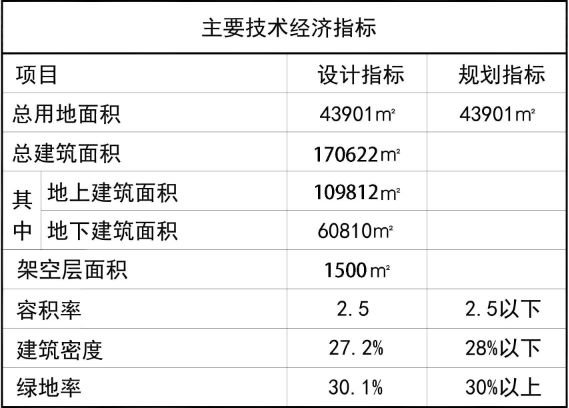 项目用地面积43901㎡,总建筑面积为170622㎡,地上建筑面积109812㎡,地下建筑面积60810㎡。容积率2.5,建筑密度27.2%,绿地率不小于30.1%。