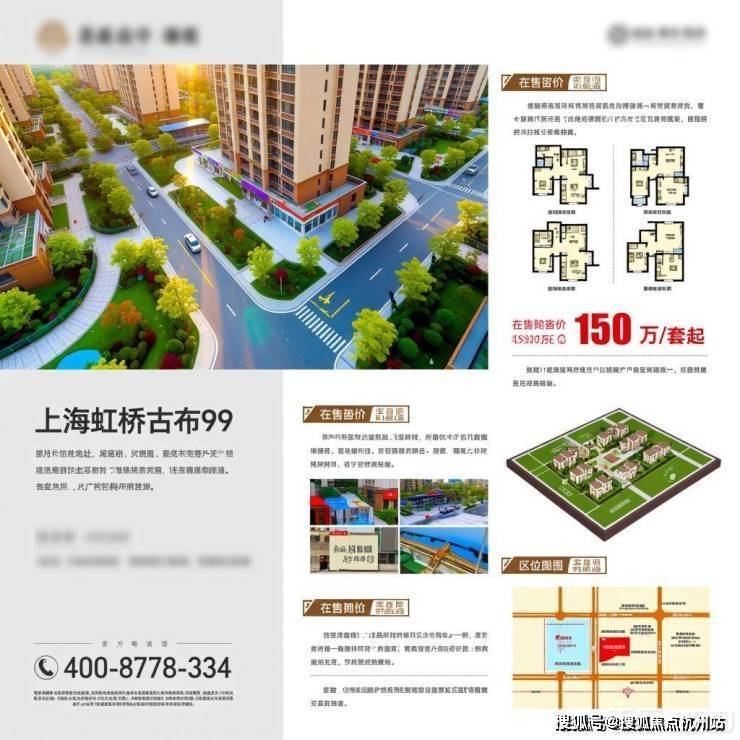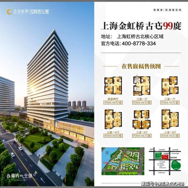 上海金虹桥古北99楼盘,突出售楼处电话、地址及各类房产相关图片,风格统一为真实房产展示,包含户型图、房价、沙盘等关键元素,信息清晰直观。