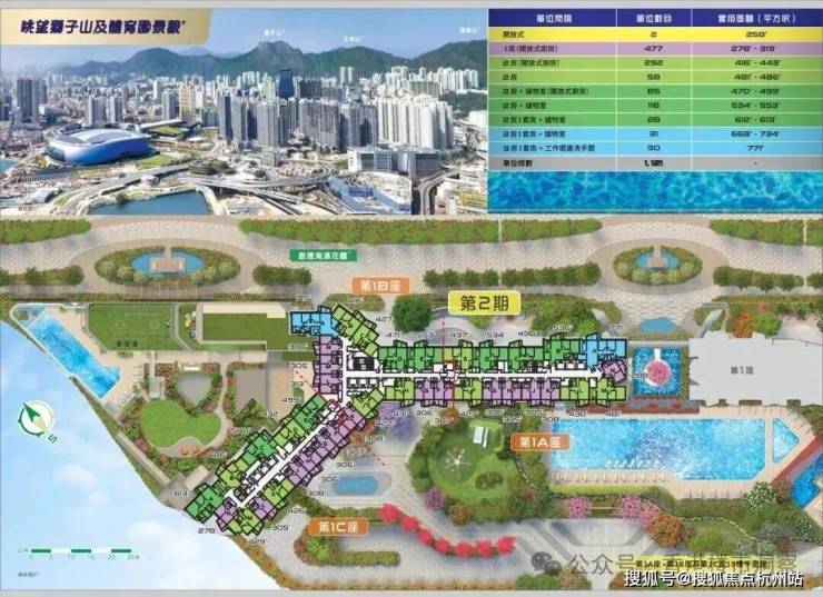启德海湾分2期一共1121套单位,分1A、1B及1C座,其中:1房约447套,两房约350套,两房(带储物间)约231套,三房约61套。4月份首开1C座,命名为启德海湾·星岚,实用面积258-771呎(约24-72m²),涵盖1房至3房。值得一提的是,项目收楼时间为今年6月底,属于超短楼花项目。