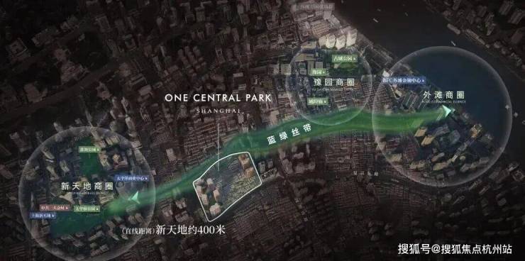 咫尺新天地 蓝绿丝带上的关键节点距离新天地直线距离约400米,作为蓝绿丝带规划上的关键节点,随着大新天地东进南拓战略逐步实施,通过水景、绿地和公共空间,串联新天地、豫园、外滩三大世界级商业版图。