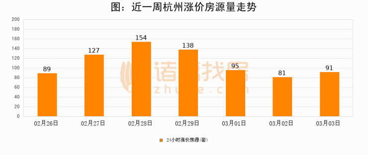 根据诸葛找房数据显示,杭州24小时涨价房源量为91套,较03月02日增加10套,环比上涨12.3%。与此同时,涨价房源占比小幅扩大,业主信心有所提升。