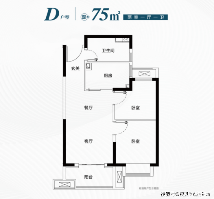建筑面积约75㎡两房:宽大阳台,明厨明卫,总价低,户型动线高效。