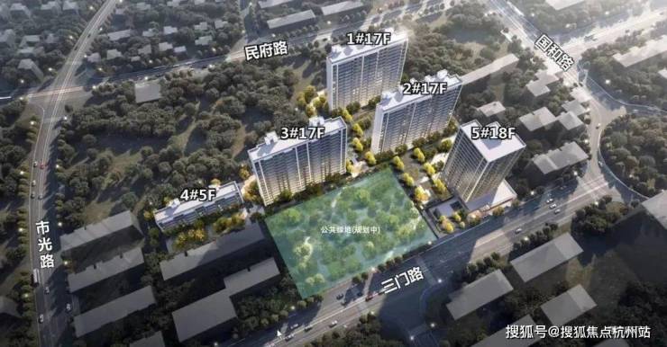 根据设计方案显示,项目拟建三栋17层商品住宅 、一栋5层商品住宅、一栋18层公租房、自持租赁住宅及配套楼(其1-2层为菜场)和一栋1层的KT电站,并设置2层地下车库。在三门路设置机动车出入口、消防应急出入口及人行出入口。