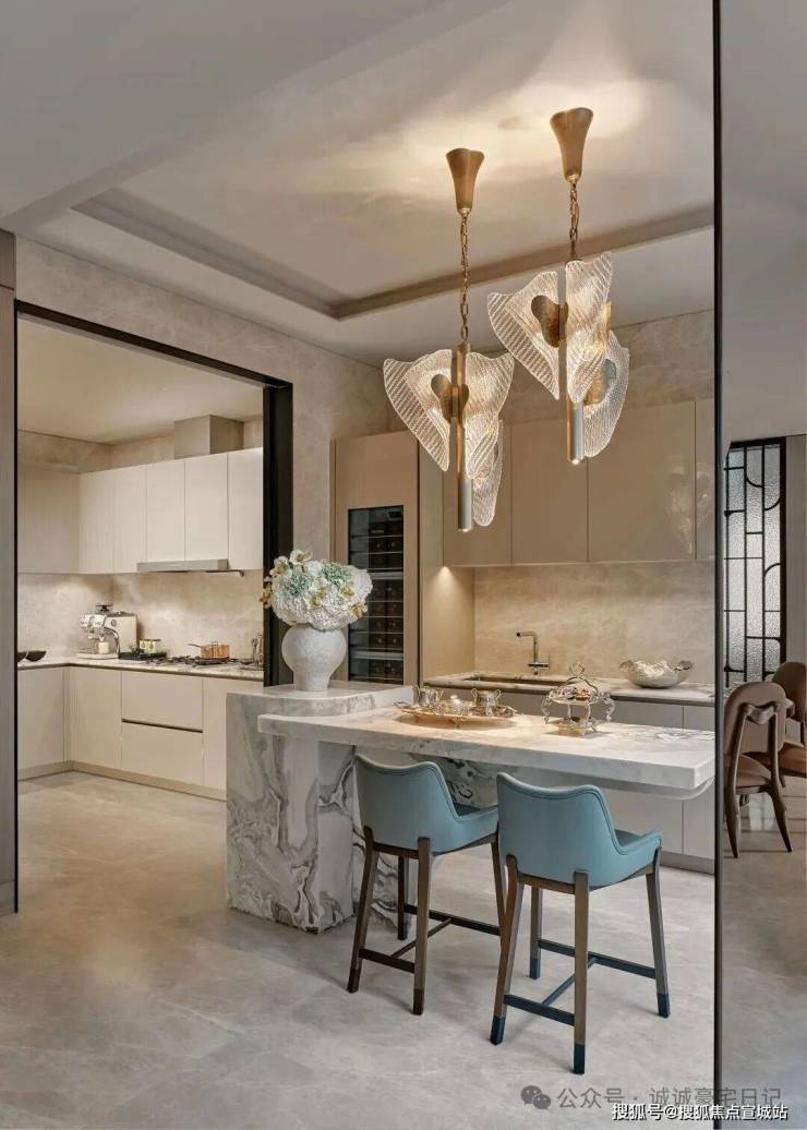 开放式布局消弭功能边界,大理石的冷冽肌理与皮革温润形成理性对话,金属线条勾勒出老城厢砖瓦的抽象轮廓,完成一场跨越时空的材质碰撞。