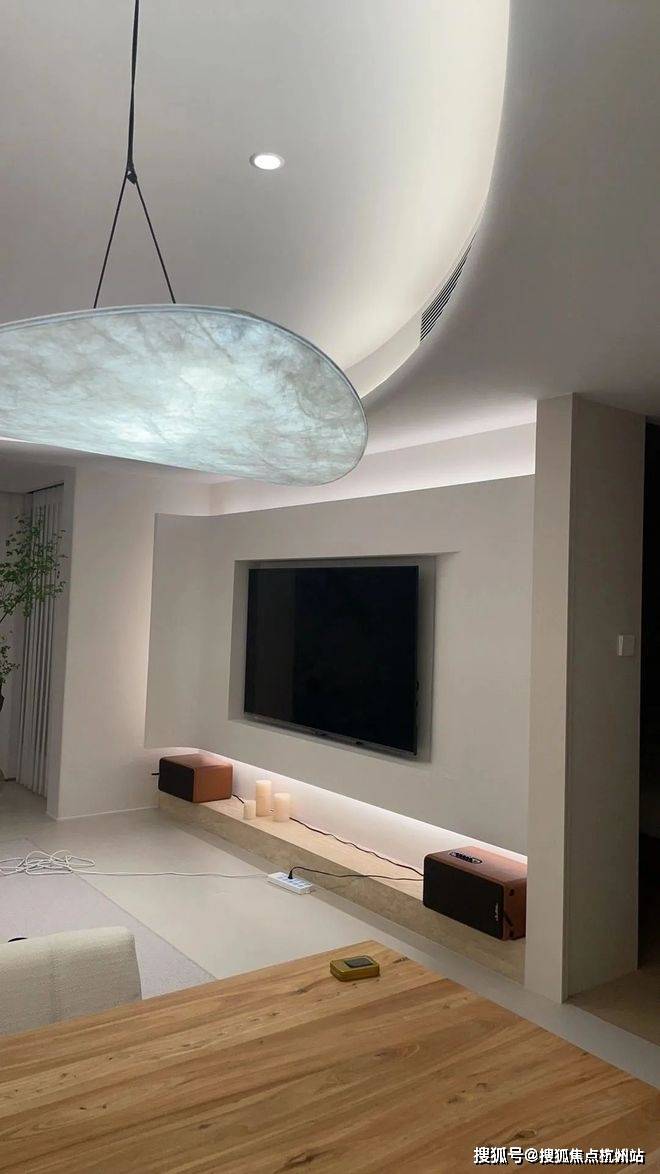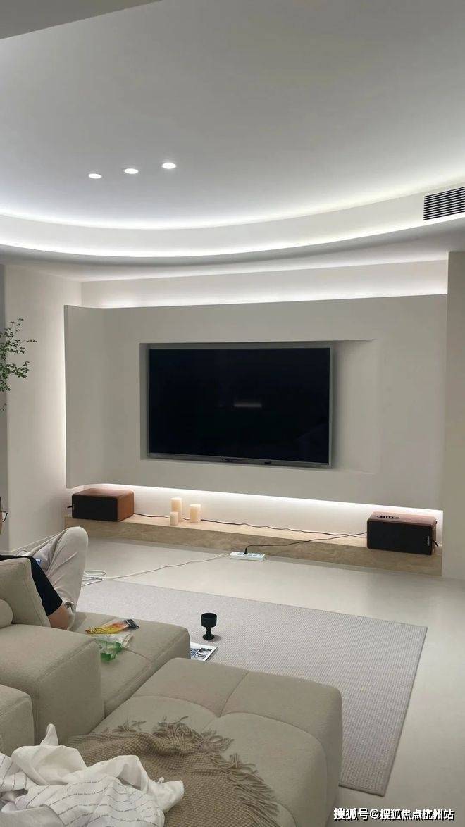 极简石膏板背景墙,看似利落大气,但一旦开始布置音响、路由器、机顶盒……高级感全无。