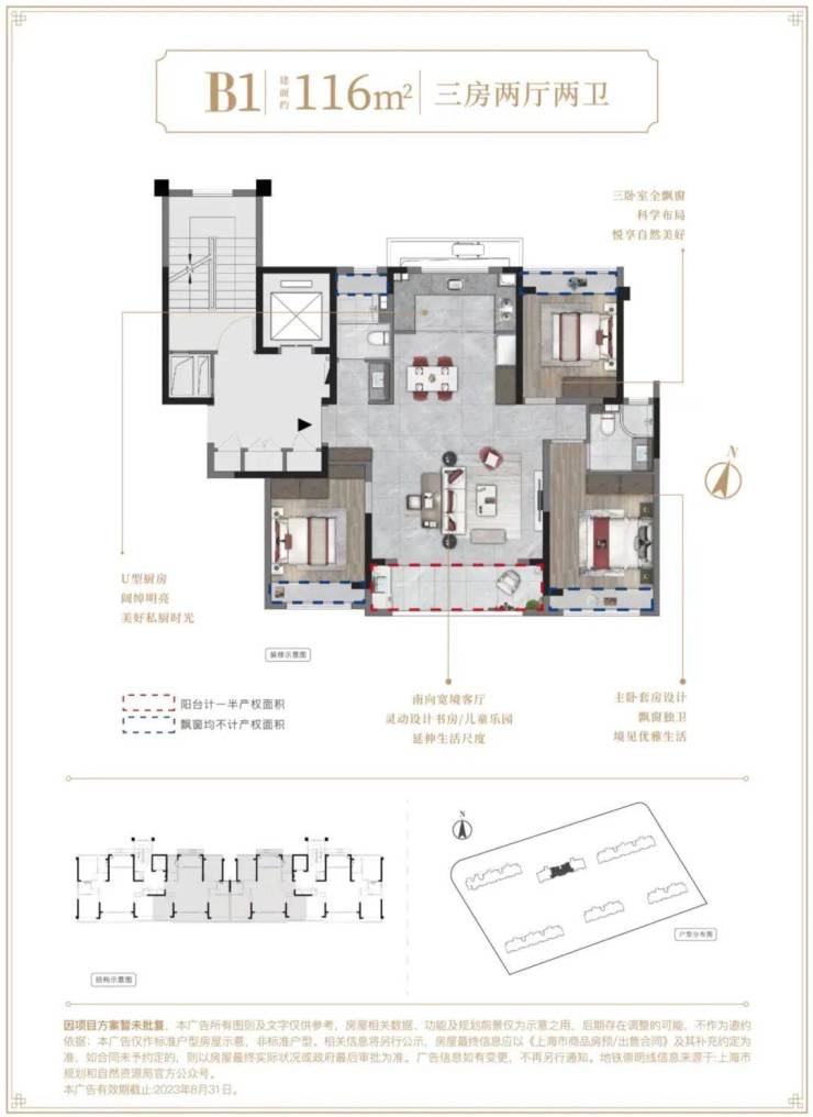 116m²户型特点:三卧室全飘窗 ,科学布局,悦享自然美好, 南向宽境客厅 ,灵动设计书房/儿童乐园,延伸生活尺度, U型厨房 ,阔绰明亮,美好私厨时光, 主卧套房设计,飘窗独卫 ,境见优雅生活。
