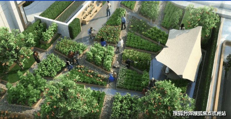 屋顶菜园:城市田园梦,人与自然的乌托邦(此处指配套用房屋顶)。一块小菜地,可以唤起人们对土地和自然的亲近感,也能让一家人在照料蔬果的时光里,创造美好、独特的共同回忆。