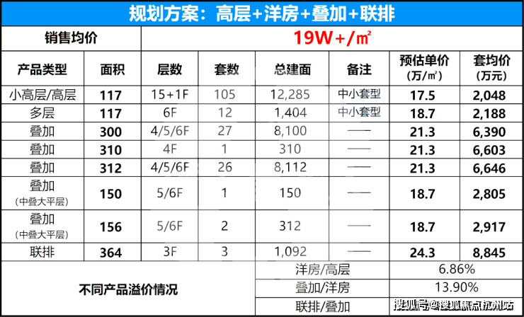 据项目最新流出的产品规划及定价方案:项目整体采用“高低配”方案,产品包括洋房、高层、叠加、联排,未来售价可能在20w+!