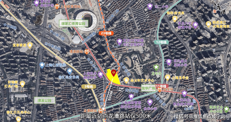 该地块位于徐汇内中环,强生花苑南面,龙华西路东侧,上海师大附中附属龙华中学西侧.出让面积达2公顷,容积率1.59,土地为商品住宅用地性质.11号线和23号线地下贯穿,地块东侧还有龙华烈士陵园和龙华寺.