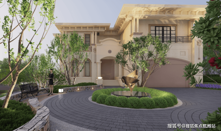 庭院摒弃了传统建筑围合法,利用层次丰富的绿篱植被分隔,与意式浮雕外立面形成视觉上的互动。