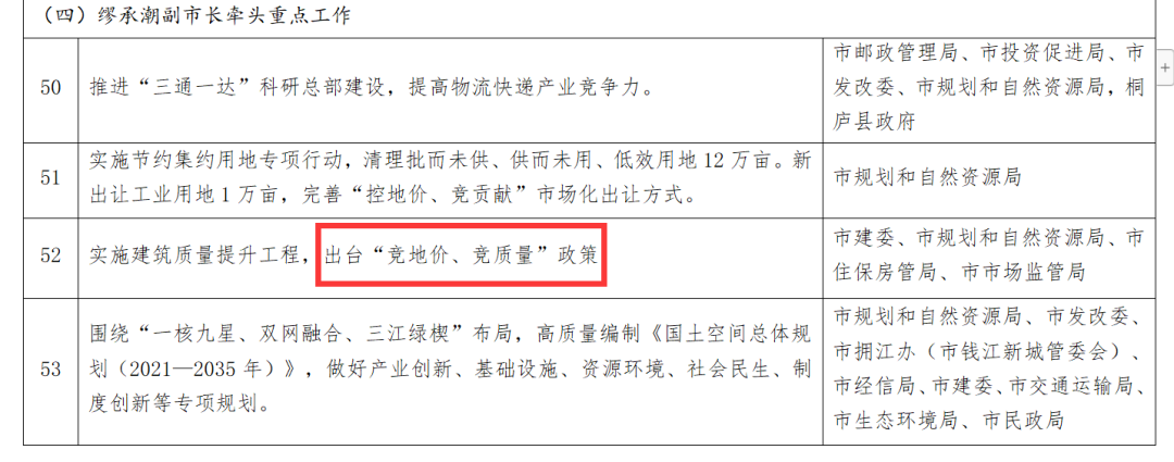 近日,杭州市人民政府官网公布了市政府工作报告2021年重点工作的责任分解,其中有一条提到:【实施建筑质量提升工程,出台“竞地价、竞质量”政策】。