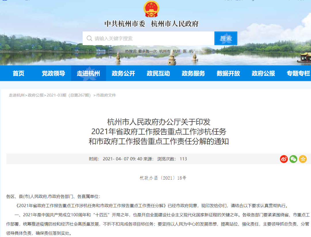不久前,杭州市政府官网公开发布《2021年省政府工作报告重点工作涉杭任务和市政府工作报告重点工作责任分解的通知》,其中,在今年的重点工作责任分解中,出现了一条——