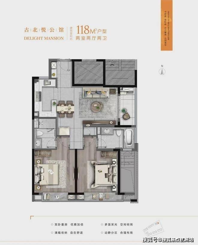 建面约 118㎡户型:宽敞布局,有一体化餐厨空间和观景阳台,储藏空间充足。