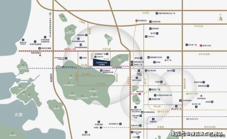 ①主城交通动脉格局:有轨电车1号线(白马涧生态园站)、轨交9号线(规划中,信息来源苏州高新发布)、何山路隧道、北环太湖大道、中环西线