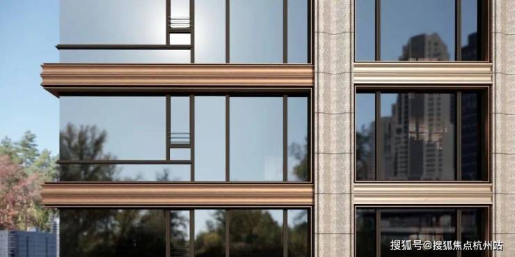 可视面都是古铜色金属铝板、米黄色铝板 / 石材、边套270°大转角飘窗,且从正面、侧面到背面,立面都保持精致统一,四面平权尽显高端质感。