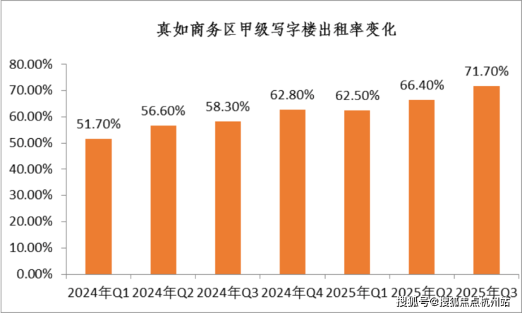 真如的产业规模十分扎实。公开数据显示, 2024 年,中海中心跃居上海写字楼年度租赁市场成交榜首。真如商务区甲级写字楼出租率也一路攀升——从2024年一季度的51.7%,提升至2025年三季度的71.7%。