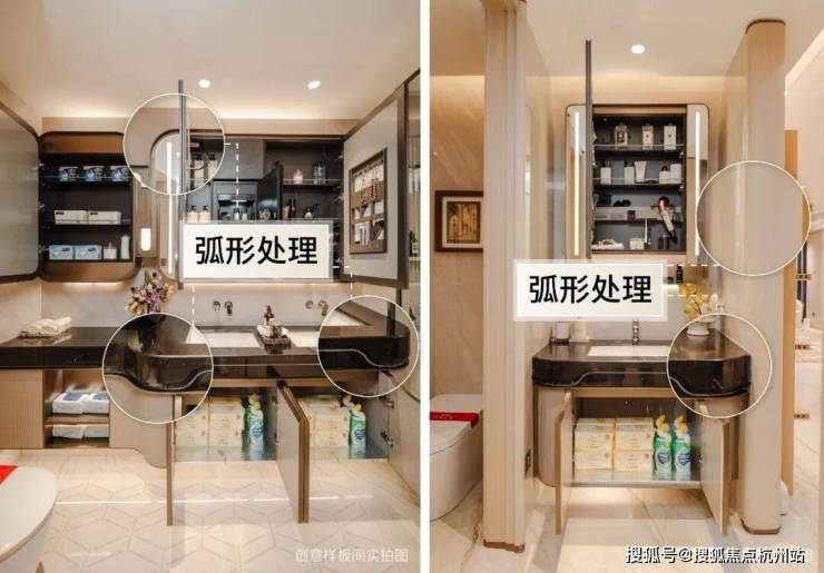 室内大量运用弧线替代直角,浴室柜采用弧形柜边,柔化空间棱角,美观又安全。