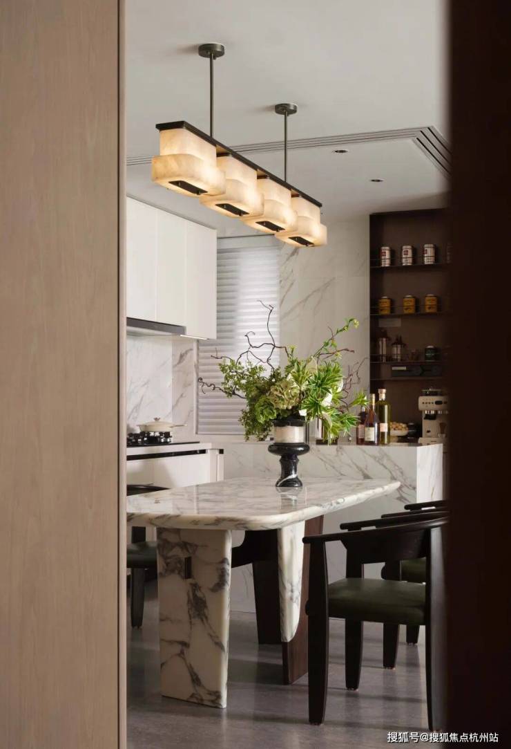 餐厅区域的玉石餐桌与背景墙材质呼应,餐具的陈设尽显仪式感,仿佛一场东方雅宴的序幕。玻璃柜与木质柜体的结合,展示了精致器物,丰富了空间层次,传达出主人对生活美学的追求。