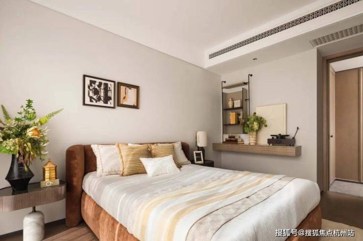 卧室空间柔和而高雅,传递出优雅与自然之气。中央的层次丰富的床品展现了对材质与色彩的精妙把控,注入舒适的休憩质感。