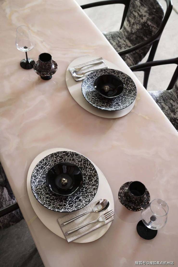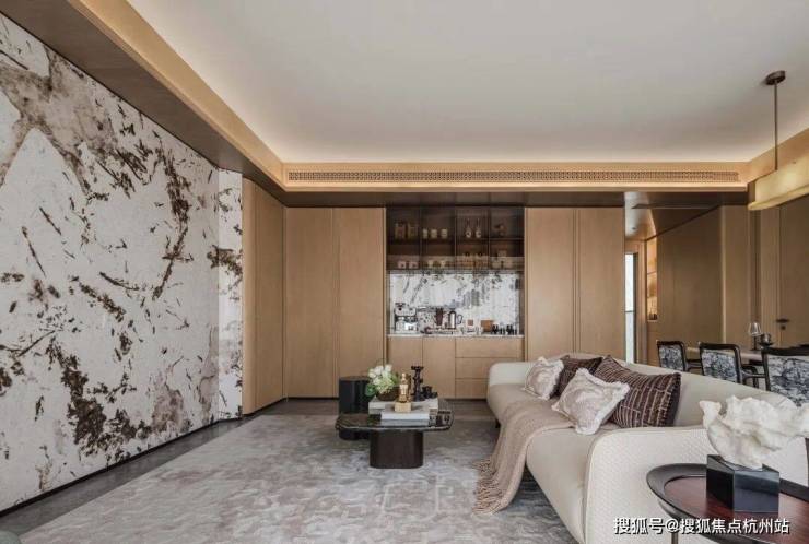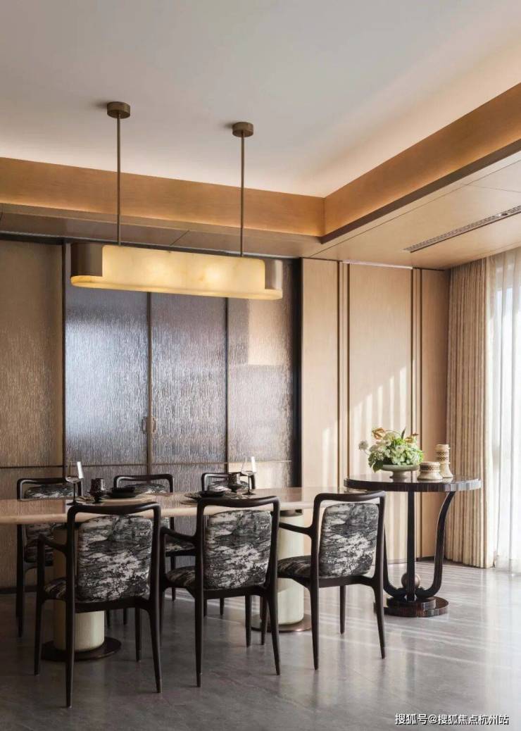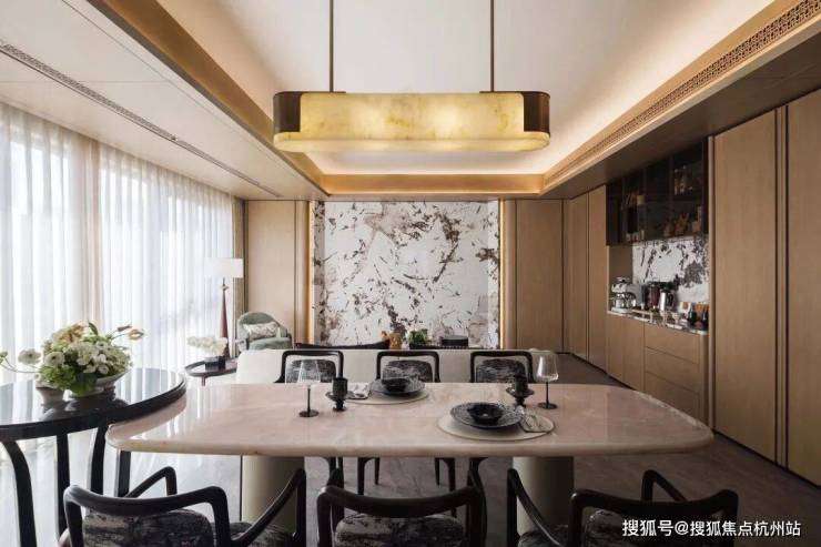 步入客餐厅,空间开阔且气势磅礴,温润的木质基调与宽敞的尺度交织出东方意境的雅致底色,宛如山间松柏,流转着自然优雅的气息,注入诗意禅韵。爱马仕潘多拉岩板背景墙以其独特的纹理与质感成为空间核心,在光线下流转出优雅与自然的气息,为空间注入了东方松间的诗意禅韵。