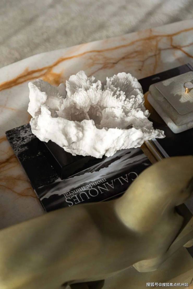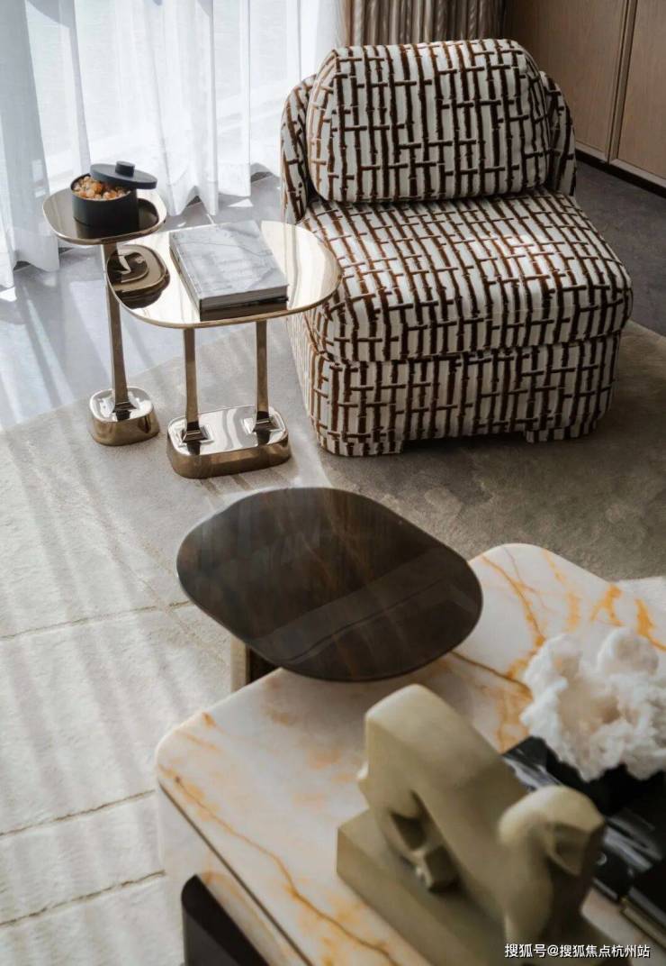 衣柜收纳区融合爱马仕潘多拉石材与宝格丽纹路夹丝玻璃柜门,金属与石材、玻璃的材质碰撞极具设计感。飘窗休闲区是观景与冥想的惬意角落,尽显生活仪式感。
