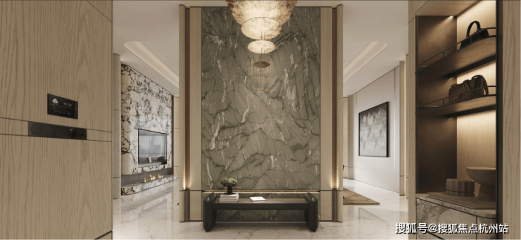 玄关处,在近5米的进口石材墙面上,不管是挂上收藏的名画,还是摆放淘来的艺术品,灯光一洗,立刻有了「私人博物馆」的范儿;