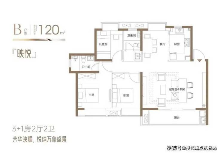 『映悦』约120㎡3+1房2厅2卫:3+1灵动空间为成长型家庭定制,容纳万象;奢阔横厅,阳光与美景,映见人生宽境;客厅与开放式书房相融,开启生活格调;IMAX巨幕观景阳台,邂逅流动的四季诗意;四面宽向阳·全明格局·全系飘窗,向美而居。