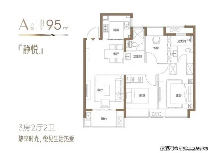 『静悦』约95㎡3房2厅2卫:三开间向阳户型,面朝风景,沐浴阳光;全明通透,让阳光照进每一寸惬意生活;户户飘窗,逐光而居,延伸空间尺度;全明卫设计,赋予私密空间明亮与清新;。方正有序的空间艺术,舒适实用,张弛有度