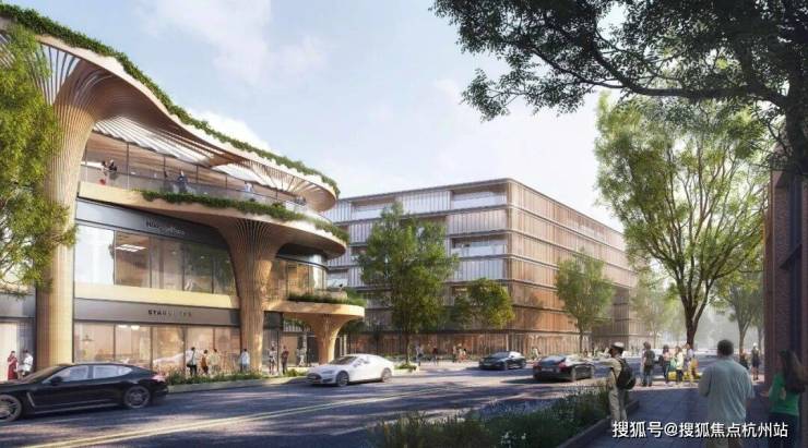 商业中心:紧邻养老中心西侧,建筑退台设计,种植丰富垂直绿化。