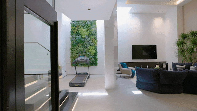 对于联排来说,地下室是充满惊喜的自由空间。 这次我们看到的样板间的层高达到了约5.6米,您可以在此设置游戏区、健身区和酒吧区等等。天井墙面及楼梯下的绿植景观将自然气息引入室内。