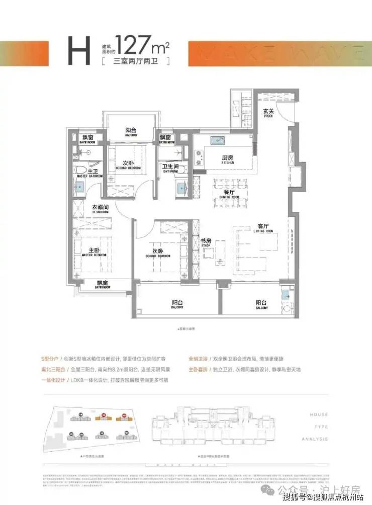 建面约127㎡三房两厅两卫,该户型最大的亮点是有着比肩豪宅的南北三阳台黄金布局,这是2025年之后,松江首个三阳台户型。