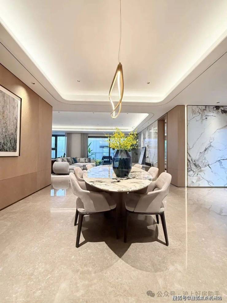 比起中规中矩的直线,弧形施工工艺更复杂、造价更高,却多了几分灵动轻盈!这种弧形的元素不只是在样板间里,在售楼处也能经常看到,比如电梯厅。