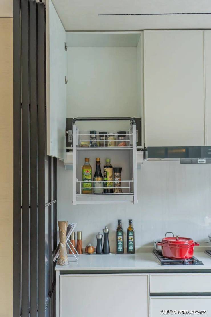 收纳系统是骊住的魔法五金:高柜里有旋转拉篮,再深的东西一转就出来;吊柜有升降拉篮,轻轻一拉,东西就送到手边,彻底不用踮脚爬高。