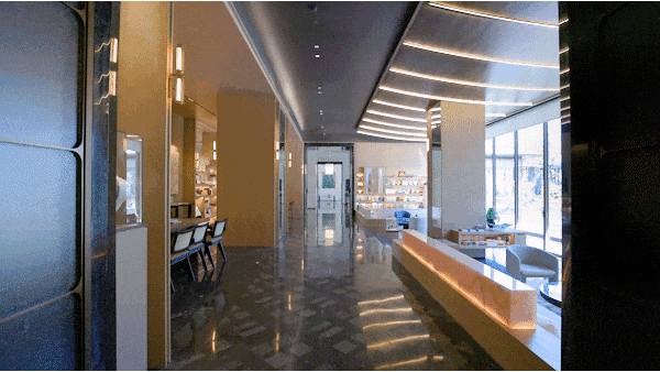 西入口门头,汲取张江科学之门金色塔冠的灵感,化身为一座现代语境下的“玲珑宝盒”。将科技感与东方美学融于一体,这不仅是一扇门,更是一段序曲——仿佛整座城市的繁华都在为您加冕。