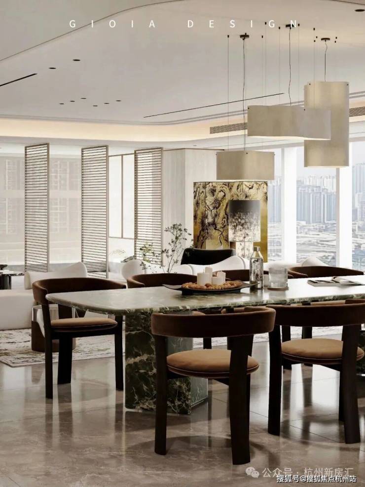 移步餐厅,Visionnaire Previous 餐桌以卡里冰玉大理石点亮空间。冰白色石材中若隐若现的浅灰纹路,如江南烟雨晕染的诗意,与翡丽风格芬迪白大理石墙面形成材质延伸。