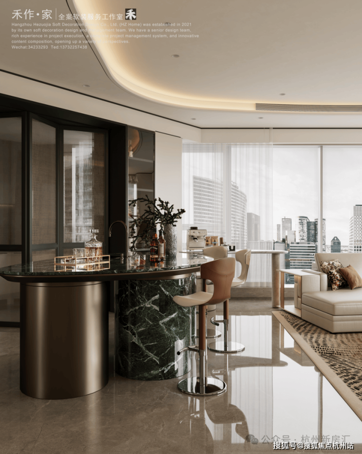 将艺术感进一步融入日常中。特别设计的专属门厅空间,是从电梯厅延伸到家,如同一处艺廊,放慢人的情绪;室内选用了浅金色奢石(外界也称其为“芬迪白大理石”)作为主要的石材,曲面的木饰面也为浅色,整体给人以明亮感。