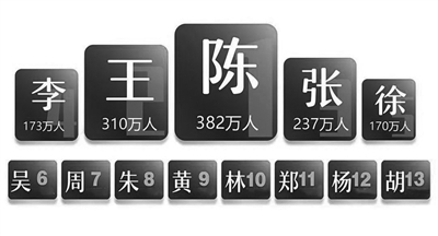 另外,吴姓163万人,排第六;周姓153万人,第七;朱姓123万人,第八;黄姓117万人,第九;林姓114万人,第十;郑姓112万人,第十一;杨姓110万人,第十二;胡姓104万人,第十三。