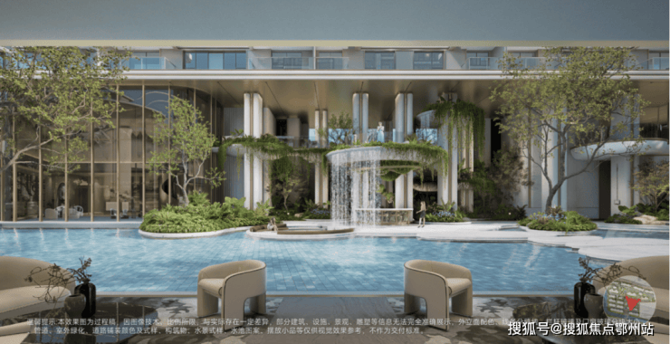 步入社区,首先会震撼于约1600㎡下沉式水院。这里不是一潭静水,而是一个充满生命律动的微缩自然系统。中心是约1200㎡的超大镜面水景,池底铺设蓝水晶岩板,映照着天光云影。夺人心魄的,是环绕水景的 “云间三瀑”——三座形态、规模、声势各不相同的大型瀑布系统:有从约10米高处倾泻而下、形成环绕式水幕的大瀑帘;有由多层云盘叠级、如云间落玉盘的中型叠瀑;更有从会所泳池上空吐出的、宽达6米的凌空瀑涌。三瀑共鸣,构成一场沉浸式视听盛宴。