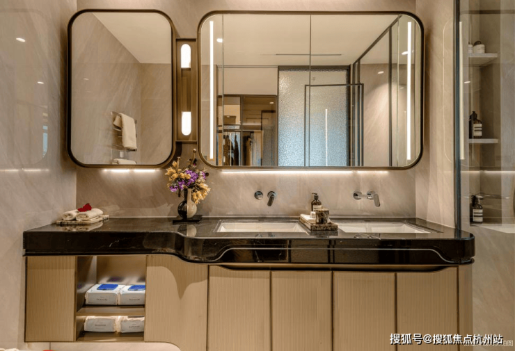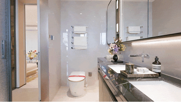 厨房里的“品质宣言”:全系标配“厨电界劳斯莱斯”嘉格纳六件套,从智能巡航吸油烟机到带烘焙功能的烤箱,诠释顶级烹饪艺术。值得称赞的是厨卫墙面都采用大块岩板铺贴,区别以往的瓷砖多个拼缝更加的美观整洁。