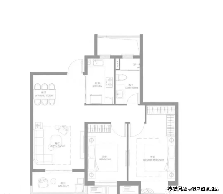 建面约90㎡两房两厅一卫,两间卧室朝南,舒适尺度搭配观景阳台,干湿分离的独立卫浴。