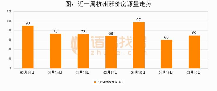 根据诸葛找房数据显示,杭州24小时涨价房源量为69套,较03月19日增加9套,环比上涨15%。与此同时,涨价房源占比小幅扩大,业主信心有所提升。
