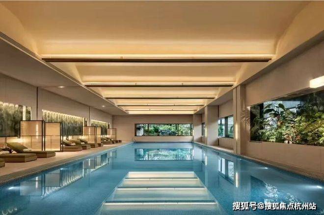 地下会所内的颜值超高的恒温泳池,抬头是波浪型穹顶,低头则是马赛克铺贴的《水中的宝玉》。