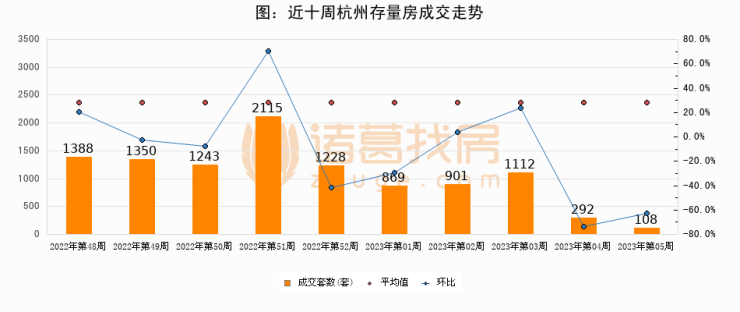 存量房方面,第05周杭州存量房成交108套,较上周减少184套,环比下降63%。从近十周成交走势来看,周均成交套数为1060套,本周低于平均水平89.8%。