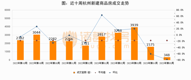 进入2023年第05周(01月23日-01月29日),杭州新建商品房成交348套,较上周减少1227套,环比下降77.9%