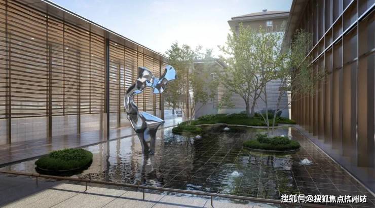 水作为贯穿兴云间整座园区最重要的元素之一,主入口处的水景雕塑《晓风艺墅》具有至关重要的地位,金属的光泽与水光的灵动交相辉映,成为空间中的点睛之笔。