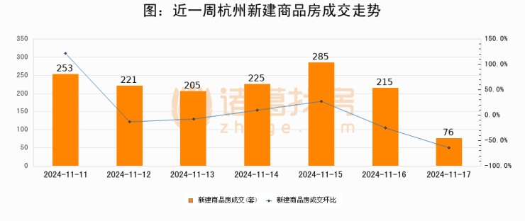 根据杭州市住房保障和房产管理局数据显示,2024年11月17日杭州新建商品房成交76套,较昨日减少139套,环比下降64.6%