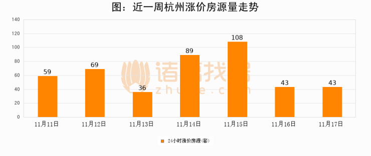 根据诸葛找房数据显示,杭州24小时涨价房源量为43套,较11月16日持平。