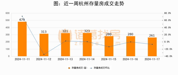 从存量房来看,2024年11月17日杭州存量房单日成交261套,比昨日减少19套,环比下降6.8%。从近一周存量房成交来看,杭州存量房日均成交套数为322套,11月17日单日成交261套,低于近一周平均水平18.9%。